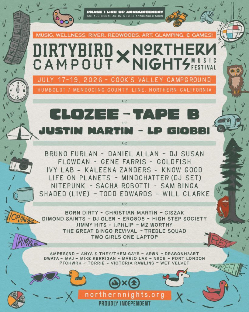 Dirtybird Campout y Northern Nights, dos de los festivales independientes más importantes del norte de California, anunciaron su primera fase de artistas para 2026, que se celebrará del 17 al 19 de julio en Cook’s Valley Campground, entre los condados de Humboldt y Mendocino. La colaboración, que debutó con éxito en 2025, continúa enfocándose en la independencia y la curaduría musical, presentando más de 40 artistas que combinan talentos emergentes con favoritos del público. El line up incluye a CloZee, Tape B, Justin Martin y LP Giobbi, ofreciendo una mezcla diversa de géneros, desde house, bass, grime y funk psicodélico, hasta actuaciones en vivo híbridas que buscan la exploración sonora y la experiencia inmersiva en la naturaleza.