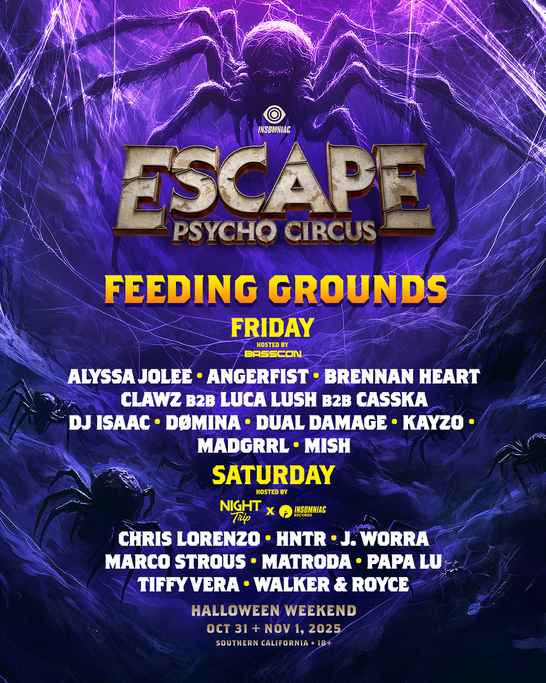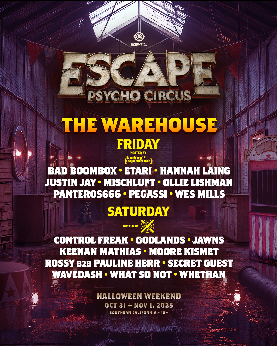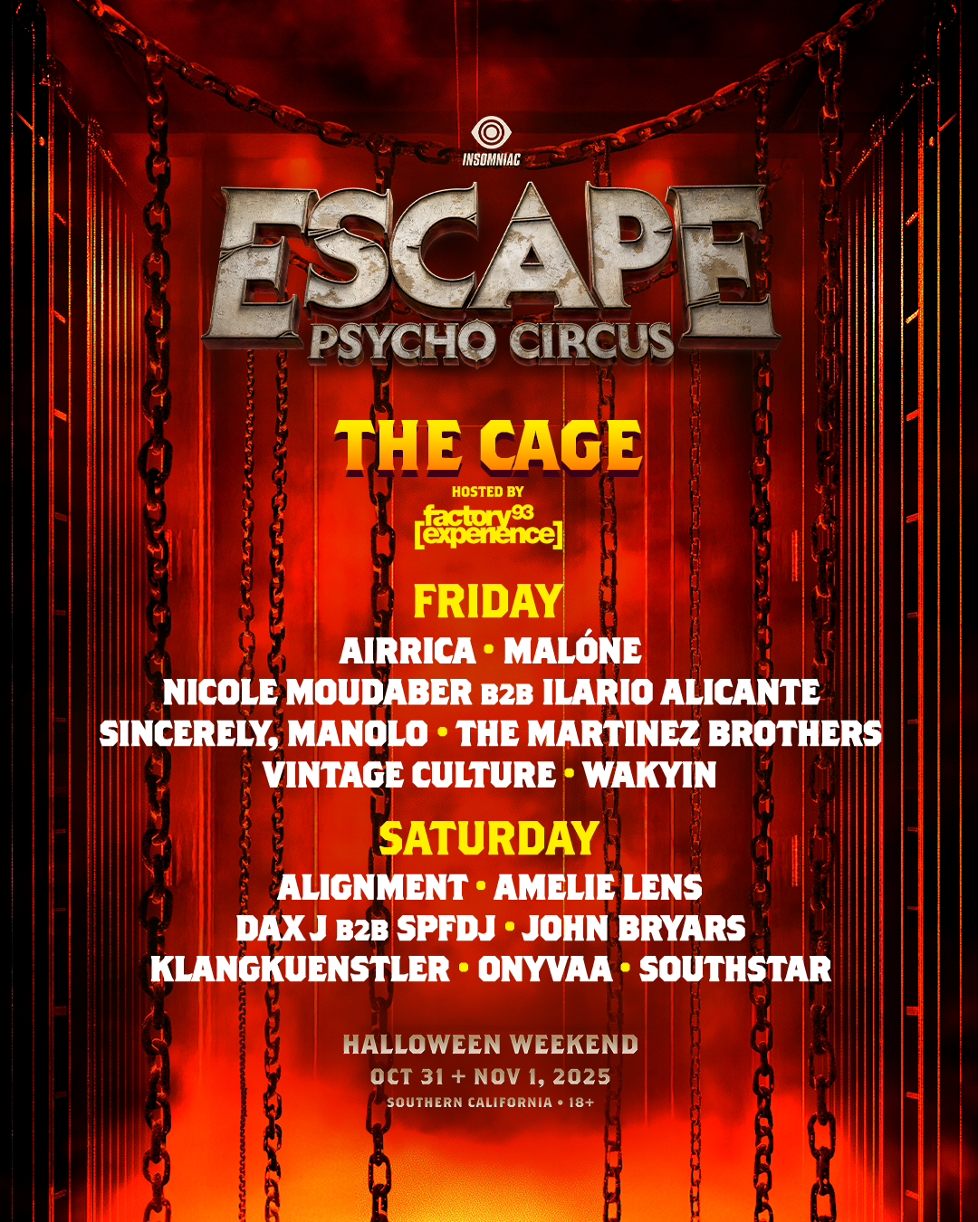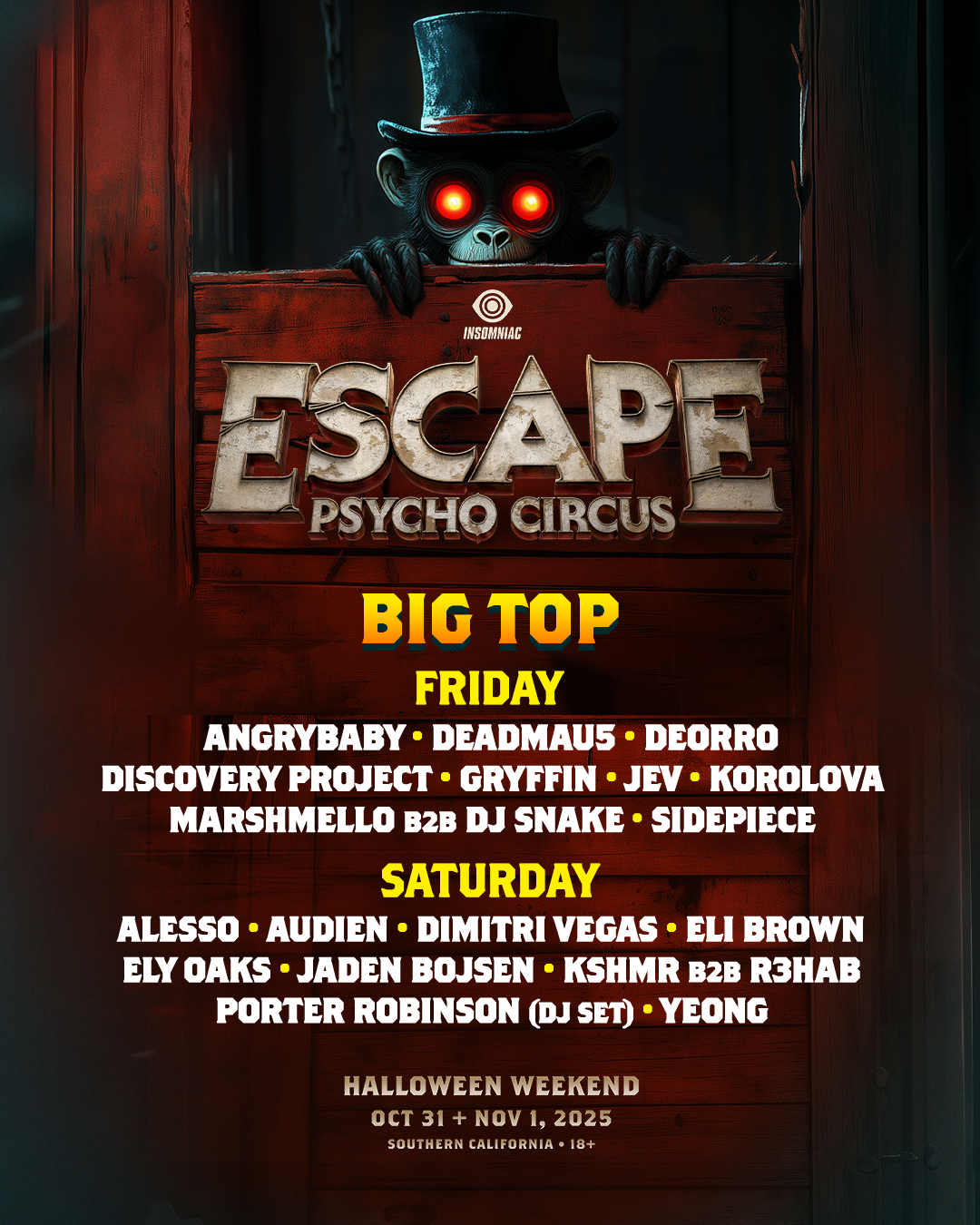 Escape Psycho Circus 2025, organizado por Insomniac, ha revelado su impresionante line up por escenarios, con más de 90 artistas de renombre internacional distribuidos en más de cinco escenarios inmersivos. Este año se estrena “The Big Top”, un nuevo escenario principal que sustituye a “The Grimm” y ofrece una atmósfera de carnaval oscuro y energía desbordante. Figuras como Alesso, deadmau5, Marshmello B2B DJ Snake y Porter Robinson encabezarán este escenario. Otros espacios como “The Warehouse”, “The Cage”, “The Feeding Grounds” y “Sewer District” ofrecerán propuestas musicales variadas que van desde el techno y el house hasta el bass y el hardstyle, con colectivos como Factory 93, Basscon, Night Trip y Sable Valley a cargo de las distintas jornadas.