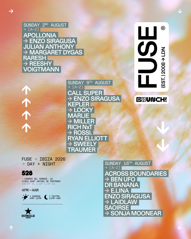 FUSE anunció la programación completa de su serie en Ibiza junto a Brunch Electronik para el verano de 2026, con tres fechas programadas los domingos 2, 9 y 16 de agosto en el recinto 528. El evento se desarrollará como una experiencia continua de 12 horas, de 16:00 a 04:00, combinando espacios al aire libre y club indoor sin interrupciones, con el objetivo de que la música y la energía evolucionen de forma natural del día a la noche. Liderado por su fundador Enzo Siragusa, quien participará en todas las fechas, el ciclo busca ofrecer una propuesta inmersiva que mezcla artistas consolidados y emergentes dentro de la escena electrónica.