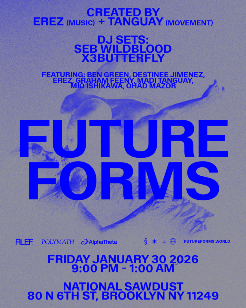 Future Forms es una nueva iniciativa performática creada por EREZ y TANGUAY que debuta el 30 de enero en National Sawdust, Nueva York. El proyecto propone un formato híbrido que fusiona música electrónica, danza contemporánea y diseño espacial inmersivo, replanteando la relación entre la performance artística y la cultura rave. Concebido como un espacio queer y transdisciplinario, Future Forms busca disolver las fronteras entre intérpretes y público, invitando a los asistentes a participar activamente a través del movimiento, el sonido y la experiencia colectiva del cuerpo en acción.