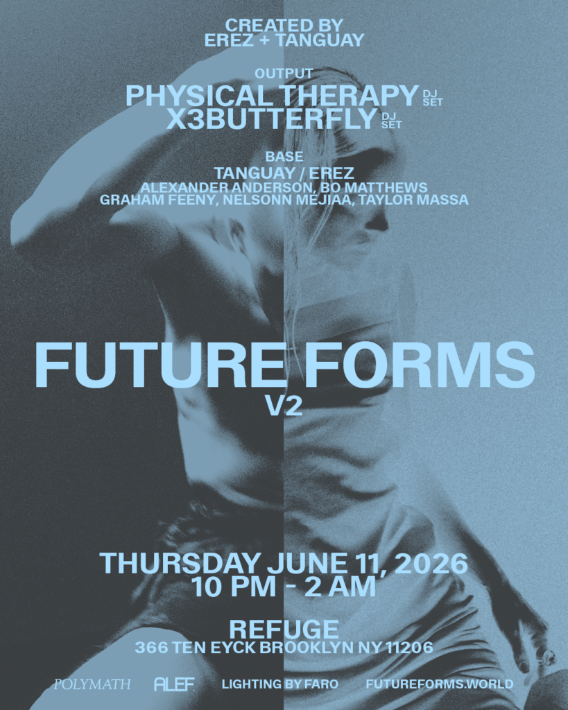 Future Forms anuncia su segunda edición, Future Forms V2, que se celebrará el 11 de junio en Refuge, Brooklyn, combinando danza contemporánea y música electrónica en un formato híbrido entre performance en vivo y cultura club. El evento contará con una actuación original de EREZ y Tanguay junto a un elenco internacional de bailarines contemporáneos, seguida de DJ sets de Physical Therapy y x3butterfly. El proyecto, fundado desde una perspectiva queer, busca romper la barrera entre artista y público, invitando a los asistentes a participar activamente y explorar la conexión entre movimiento y sonido en tiempo real.