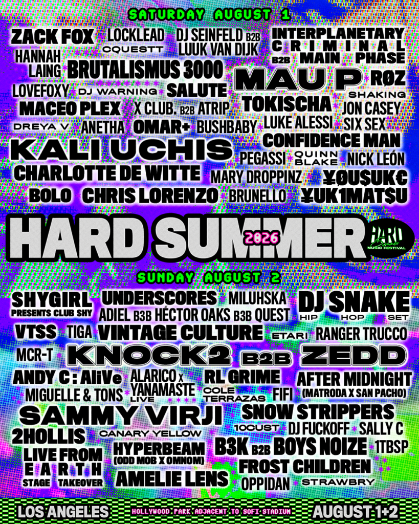 El festival HARD Summer Music Festival anunció una nueva ronda de artistas para su edición 2026, que se celebrará el 1 y 2 de agosto en Hollywood Park, complejo ubicado junto al SoFi Stadium y el YouTube Theater. Entre las incorporaciones destacan el productor japonés ¥ØU$UK€ ¥UK1MAT$U, el set especial B3K B2B de Brutalismus 3000 con Boys Noize, así como el dúo latino RØZ y el proyecto alternativo 1tbsp. Estas adiciones se suman a un cartel previamente anunciado con nombres como Amelie Lens, Charlotte de Witte, DJ Snake, Kali Uchis, RL Grime y Zedd, entre muchos otros.