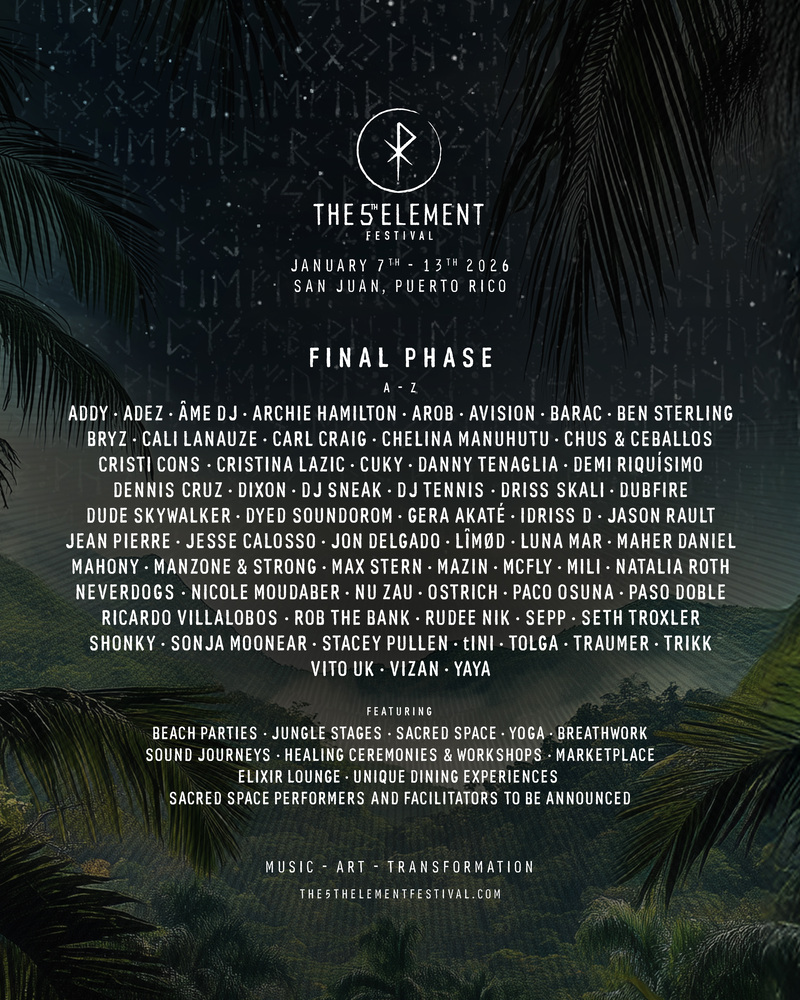 El 5th Element Festival ha revelado su cartel completo para su primera edición, que se celebrará del 7 al 13 de enero de 2026 en distintas localizaciones de San Juan, Isla Verde y Río Grande, Puerto Rico. Tras anunciar una primera fase encabezada por Dixon, Ricardo Villalobos, Seth Troxler y Nicole Moudaber, el festival suma más de 40 artistas, incluyendo figuras clave del techno y house como Carl Craig, Chus & Ceballos en su gira de reunión, Danny Tenaglia, Paco Osuna y Stacey Pullen. A ellos se agrega una amplia selección de talentos internacionales y emergentes que abarcan house, techno y minimal, consolidando una programación robusta con más de 90 artistas.