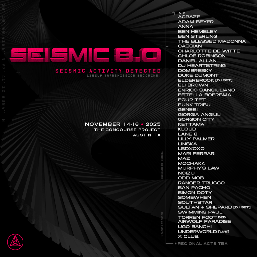 El Seismic Dance Event ha revelado la segunda fase de artistas para su edición 8.0, que se celebrará del 14 al 16 de noviembre en The Concourse Project, en Austin. Este festival, considerado uno de los referentes del house y techno en el sur de EE. UU., promete una experiencia intensa durante tres días con una mezcla de grandes figuras internacionales, talentos emergentes y una comunidad apasionada del underground. En esta nueva fase destacan nombres como Adam Beyer, ANNA, The Blessed Madonna, Dombresky, LSDXOXO, Simon Doty y más, junto a artistas innovadores y ascendentes como Giorgia Angiuli, Daniel Allan y Funk Tribu. Todo esto se suma a una fase uno ya imponente que incluye a UNDERWORLD, Four Tet, Charlotte de Witte y otros íconos de la música electrónica.